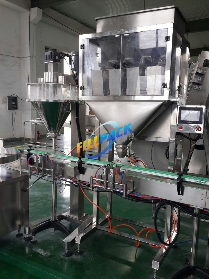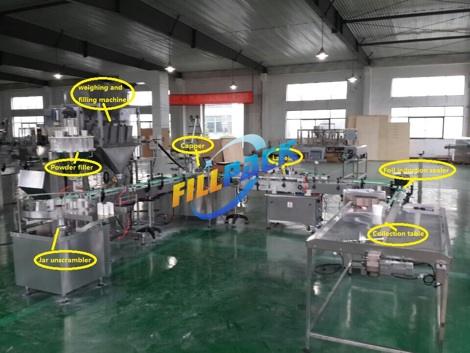 The filling line can finish measuring, filling, capping, sealing, labeling, coding, etc. because of the original design, it is suitable for packing powder and granule products, like species powder, sugar, salt, sesame, rice, seed, coffee beans, and seasonings, etc.